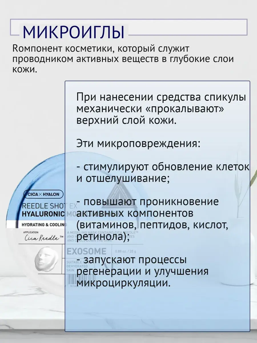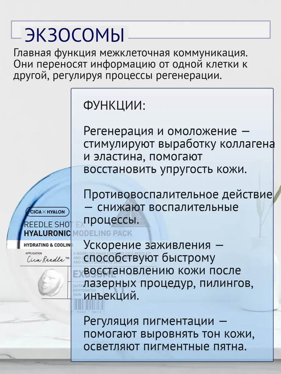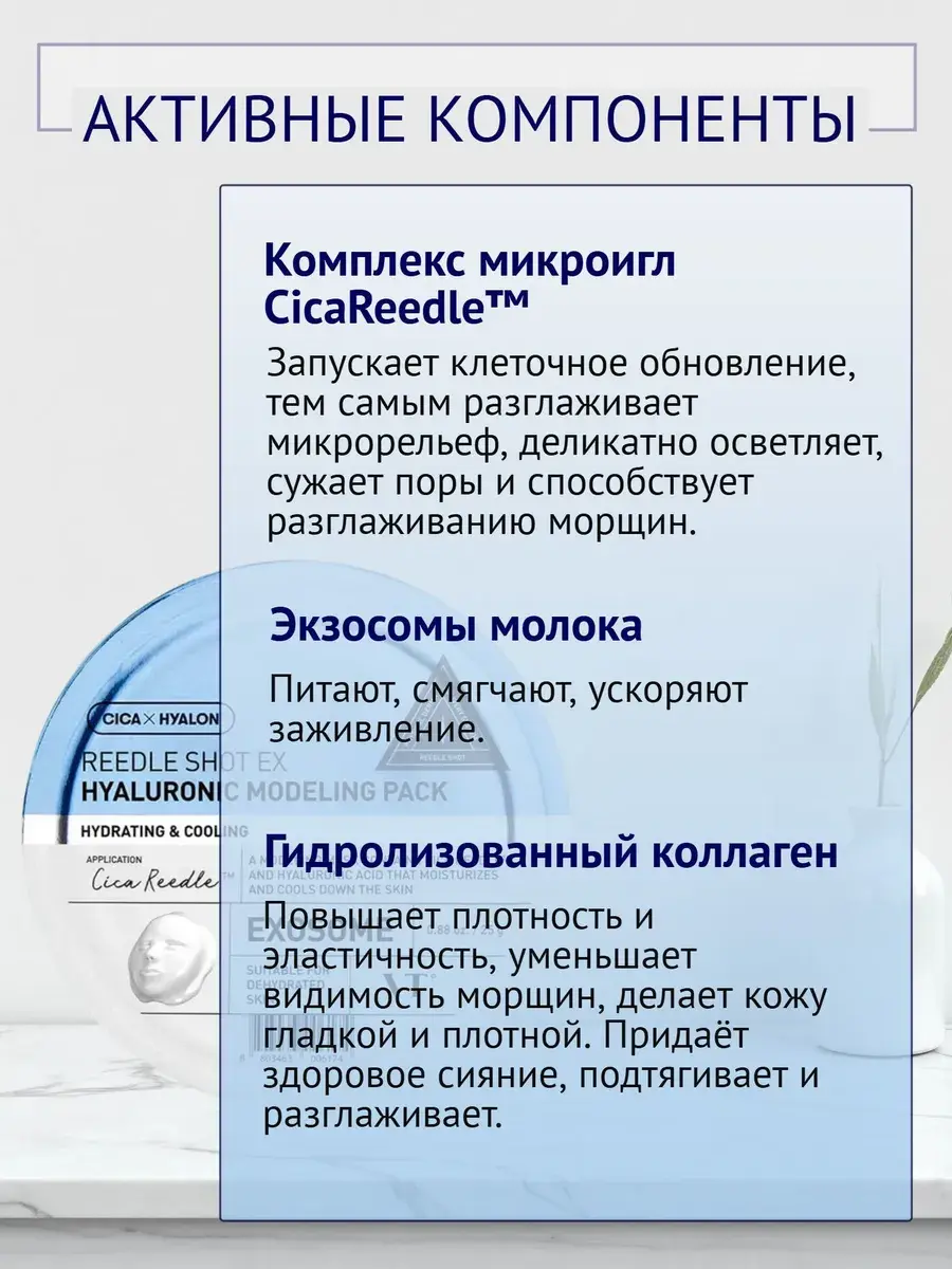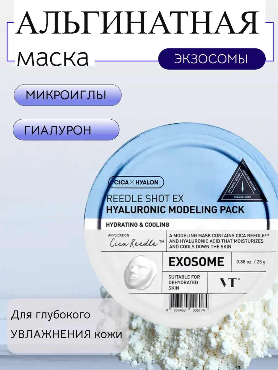 Увлажняющая альгинатная маска с микроиглами VT Cosmetics Reedle Shot EX Modeling Pack — улучшает текстуру кожи: сужает поры, уменьшает покраснение и воспаление, сокращает выраженность морщин и выравнивает тон. Маска для лица из Кореи помимо микроигл CicaReedle содержит гиалуроновую кислоту, экзосомы которые повышает упругость, увлажняет. Микроиглы не только отшелушивают, но и транспортируют активы (гиалуроновую кислоту) глубоко в эпидермис. Маска равномерно распределяется и легко снимается после застывания.