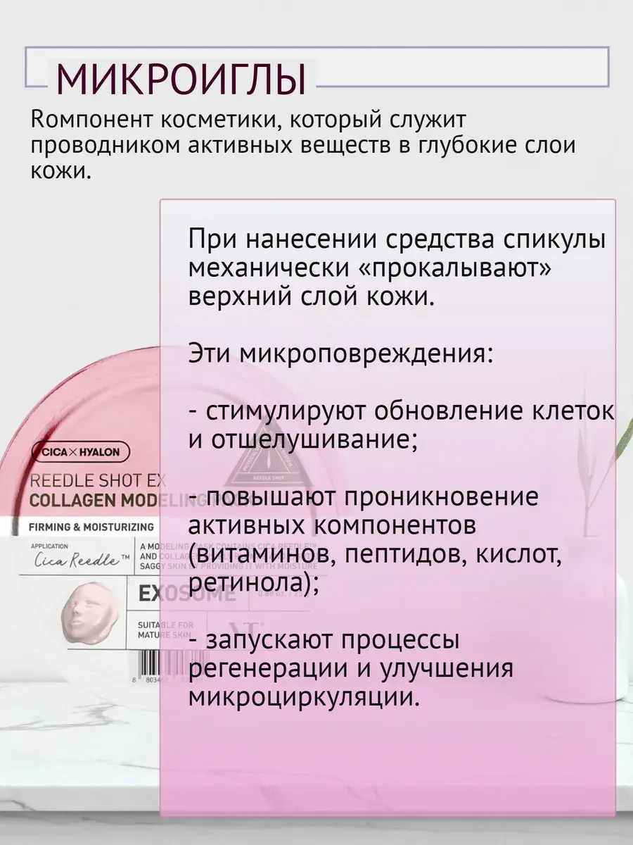 Увлажняющая альгинатная маска с микроиглами VT Cosmetics Reedle Shot EX Modeling Pack — улучшает текстуру кожи: сужает поры, уменьшает покраснение и воспаление, сокращает выраженность морщин и выравнивает тон. Маска для лица из Кореи помимо микроигл CicaReedle содержит коллаген, экзосомы которые повышает упругость, увлажняет. Микроиглы не только отшелушивают, но и транспортируют активы (коллаген) глубоко в эпидермис. Маска равномерно распределяется и легко снимается после застывания.