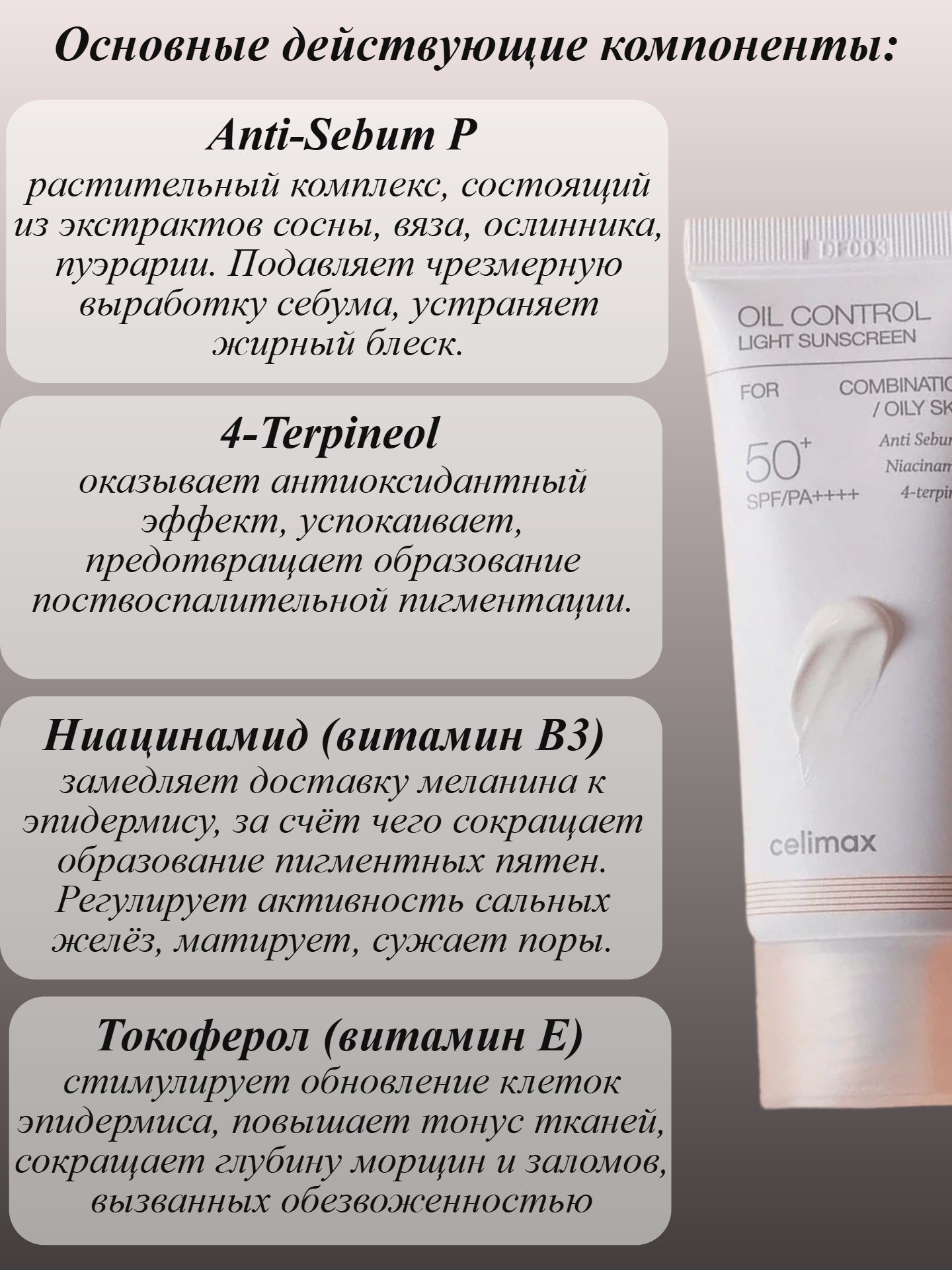 - 4-Terpineol — производное чайного дерева, оказывает антиоксидантный эффект, успокаивает, предотвращает образование поствоспалительной пигментации.