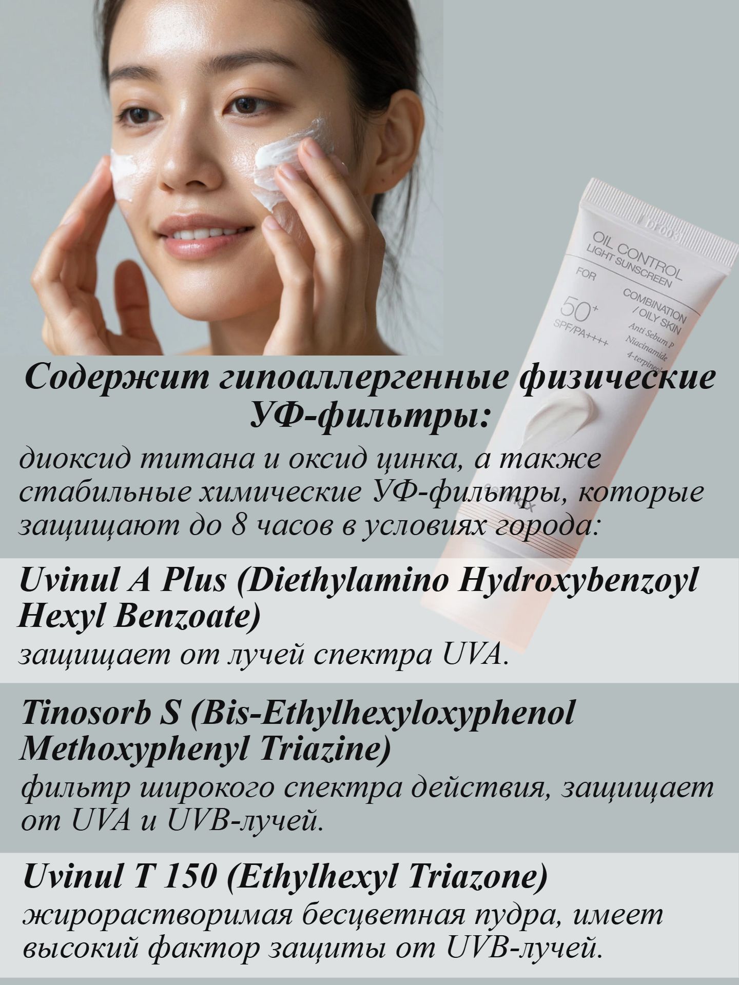 Содержит гипоаллергенные физические УФ-фильтры — диоксид титана и оксид цинка, а также стабильные химические УФ-фильтры, которые защищают до 8 часов в условиях города: