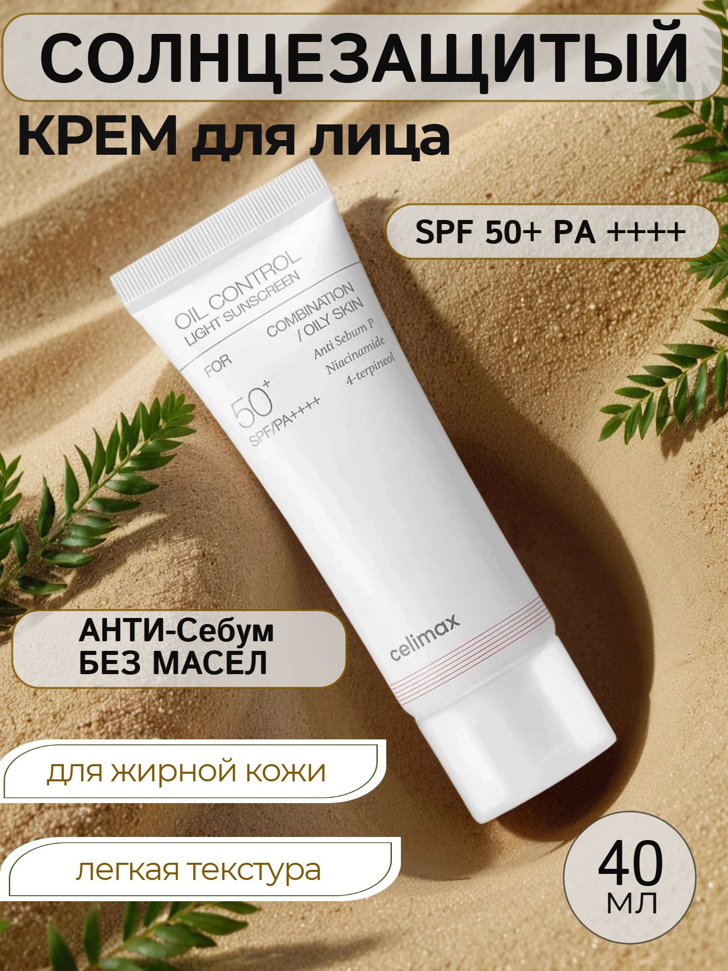 Лёгкий солнцезащитный крем для жирной кожи Celimax Oil Control Light Sunscreen SPF50+ PA++++ обладает высокой степенью защиты от УФ-лучей, предотвращает образование пигментных пятен и замедляет старение. Нормализует активность сальных желёз, выравнивает тон и матирует.