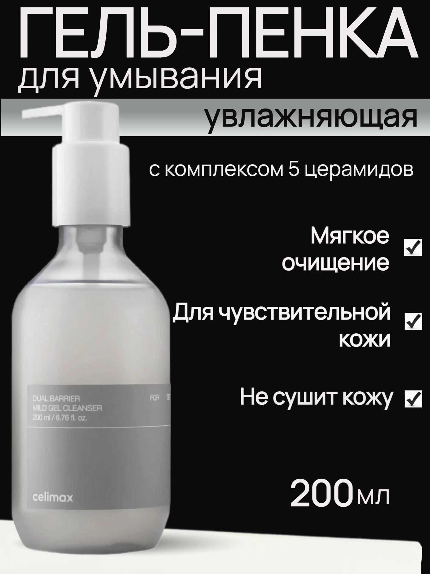 Гель-пенка для умывания с комплексом церамидов Celimax Dual Barrier Mild Gel Cleanser деликатно очищает кожу, удаляет все загрязнения, остатки макияжа и излишки себума. Не нарушает барьерных функций и не повреждает липидную мантию, не провоцирует сухости и стянутости.