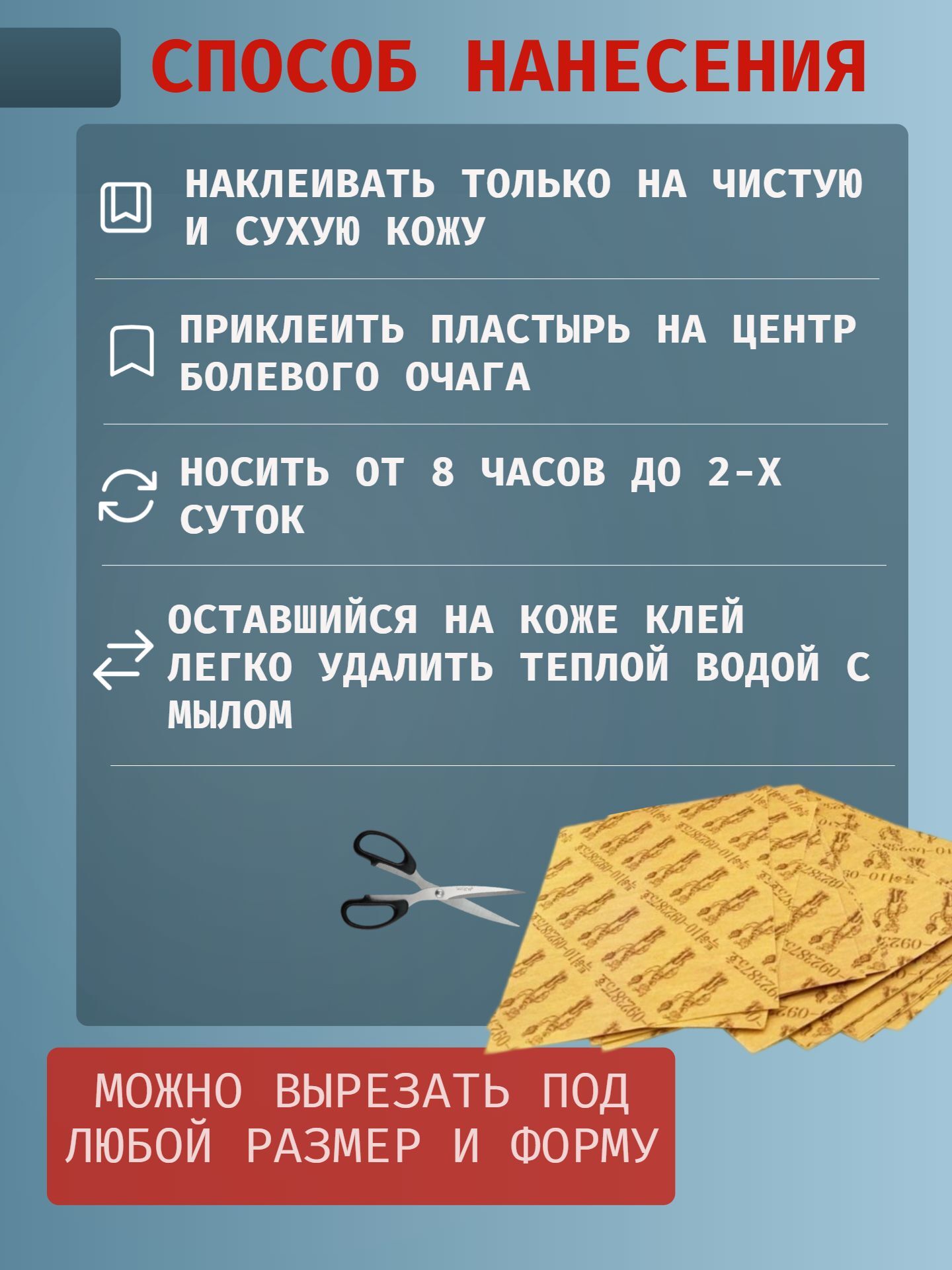 - Удобство применения: Пластырь легко наносится и снимается, не оставляет следов на коже и одежде.