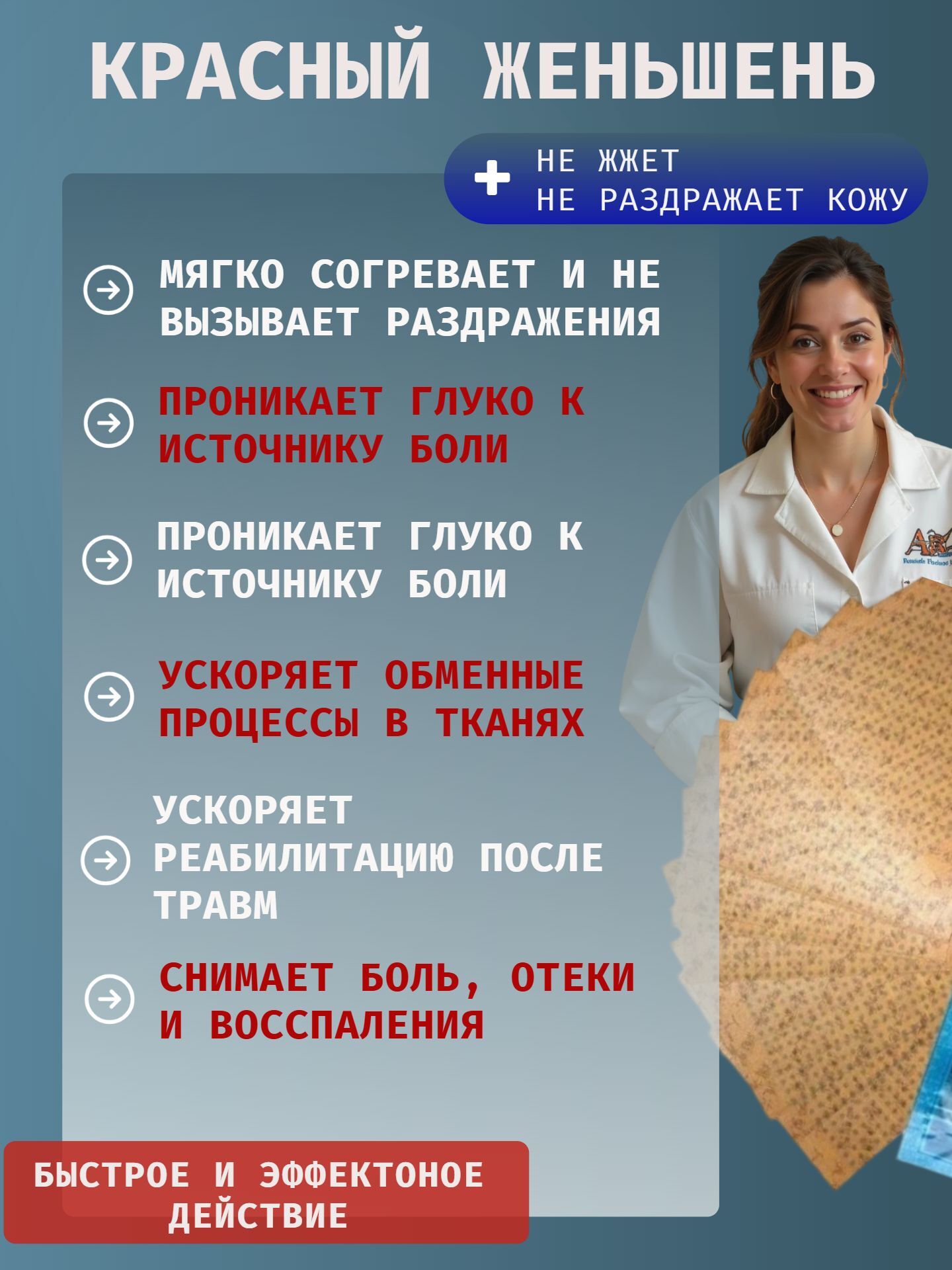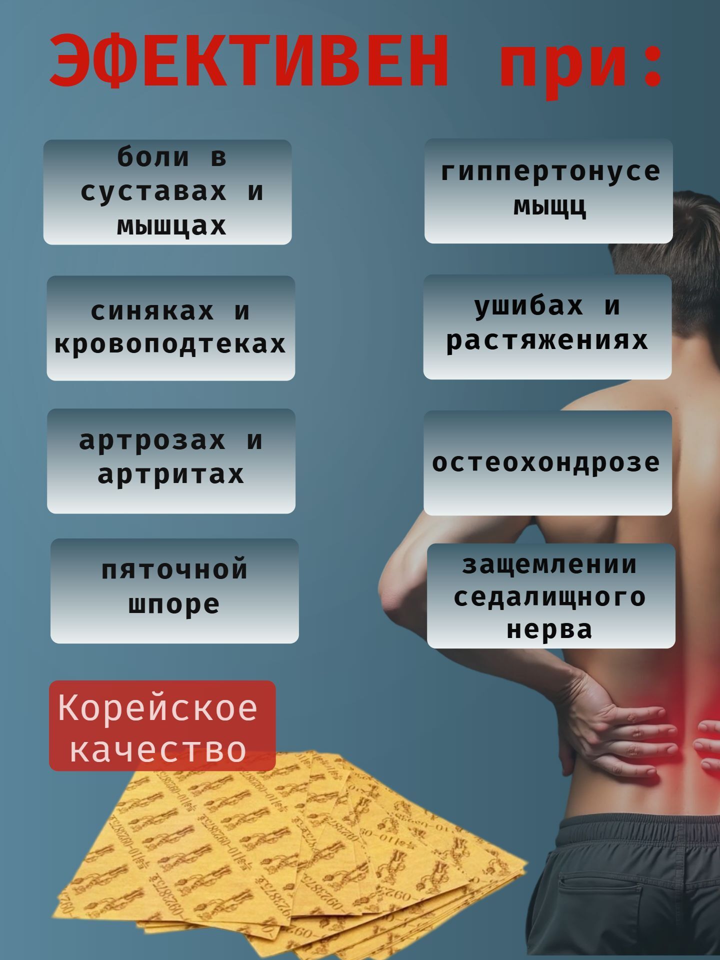 - Быстрое и эффективное облегчение боли: Благодаря синергетическому действию компонентов, пластырь быстро снимает боль и воспаление.
