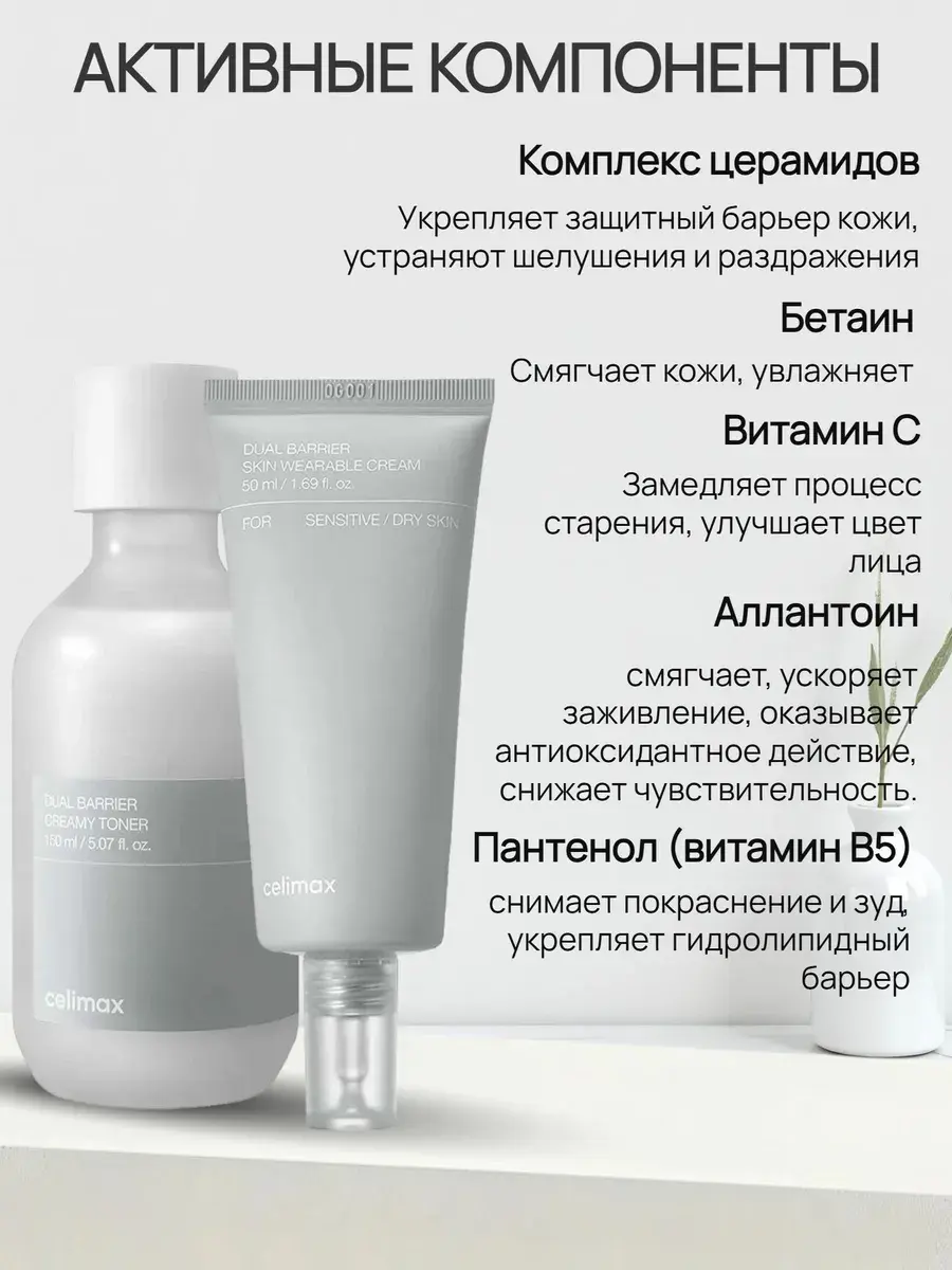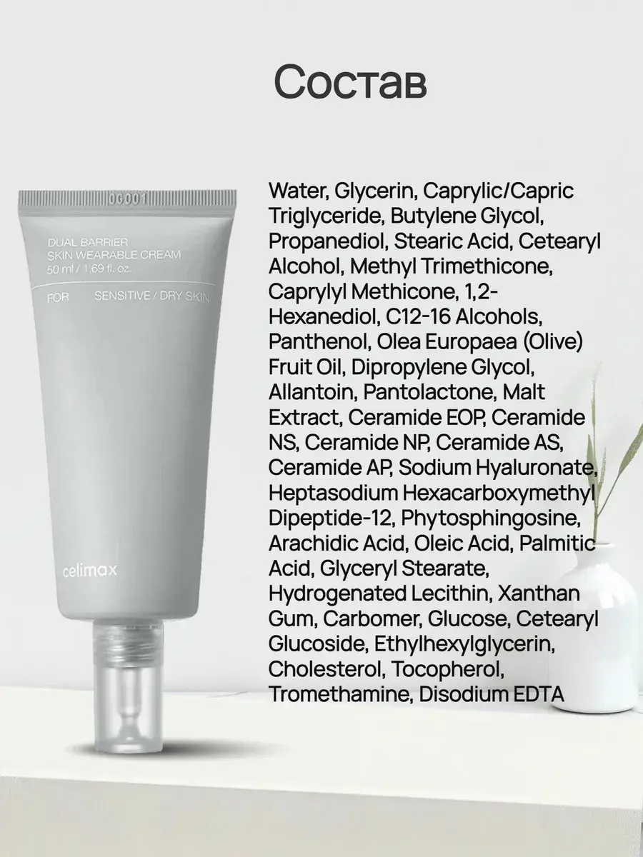 Крем Celimax Dual Barrier Skin Wearable Cream увлажняет и восстанавливает тонкую чувствительную кожу: продукт успокаивает, смягчает, избавляет от сухости и шелушения, улучшает состояние пор и устраняет чувство стянутости после умывания.
