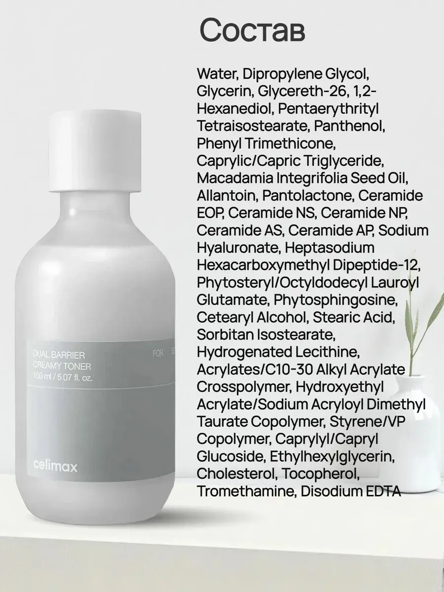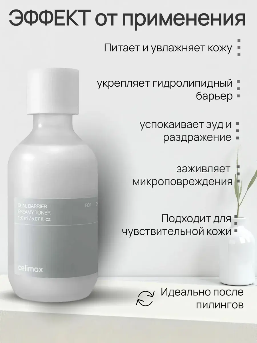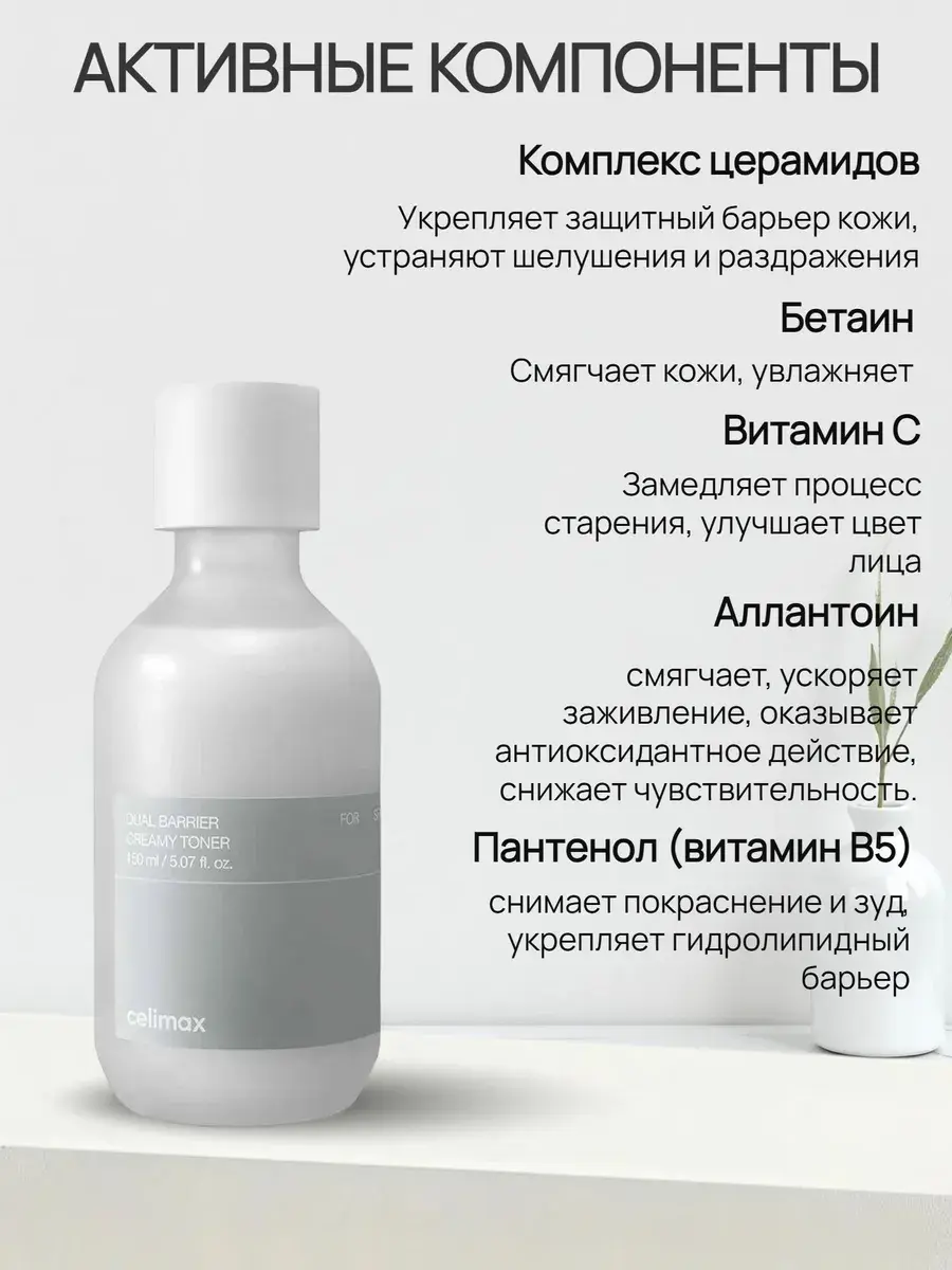 Барьерный кремовый тонер Celimax Dual Barrier Creamy Toner увлажняет, питает и восстанавливает, укрепляет естественный защитный слой и снижает чувствительность кожи к внешним раздражителям, успокаивая и смягчая. Средство устраняет шелушение и сухость, снимает раздражение и зуд, способствует заживлению. Содержит церамиды, гиалуроновую кислоту, аллантоин, пантенол и уникальный пептид Aquatide.