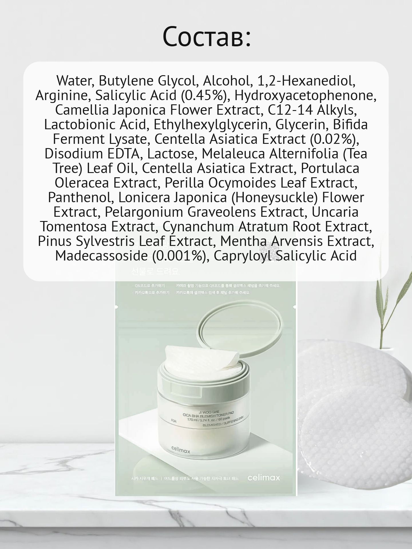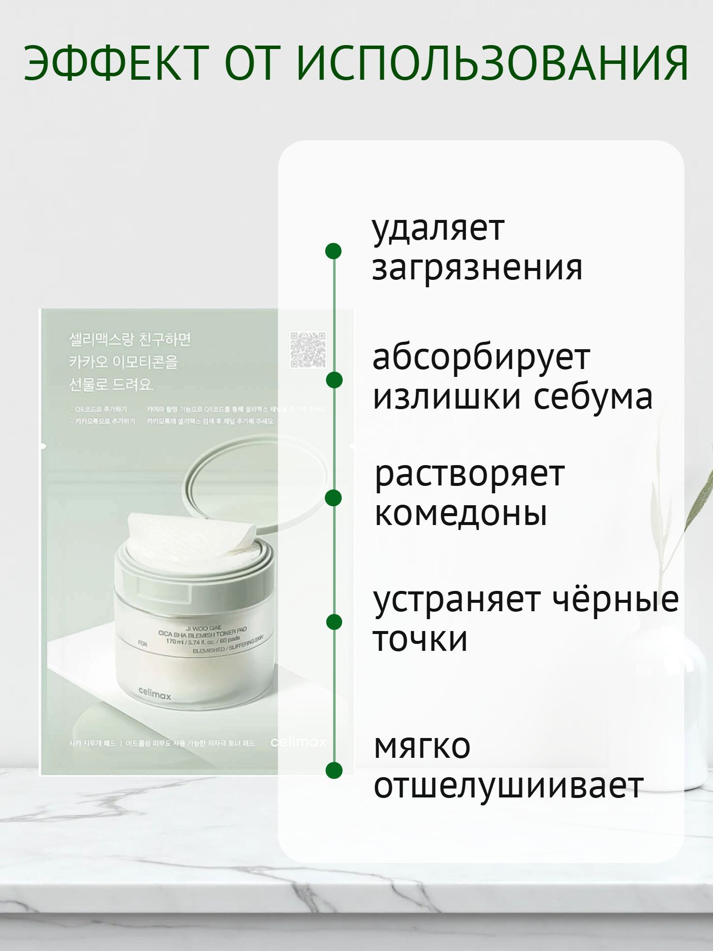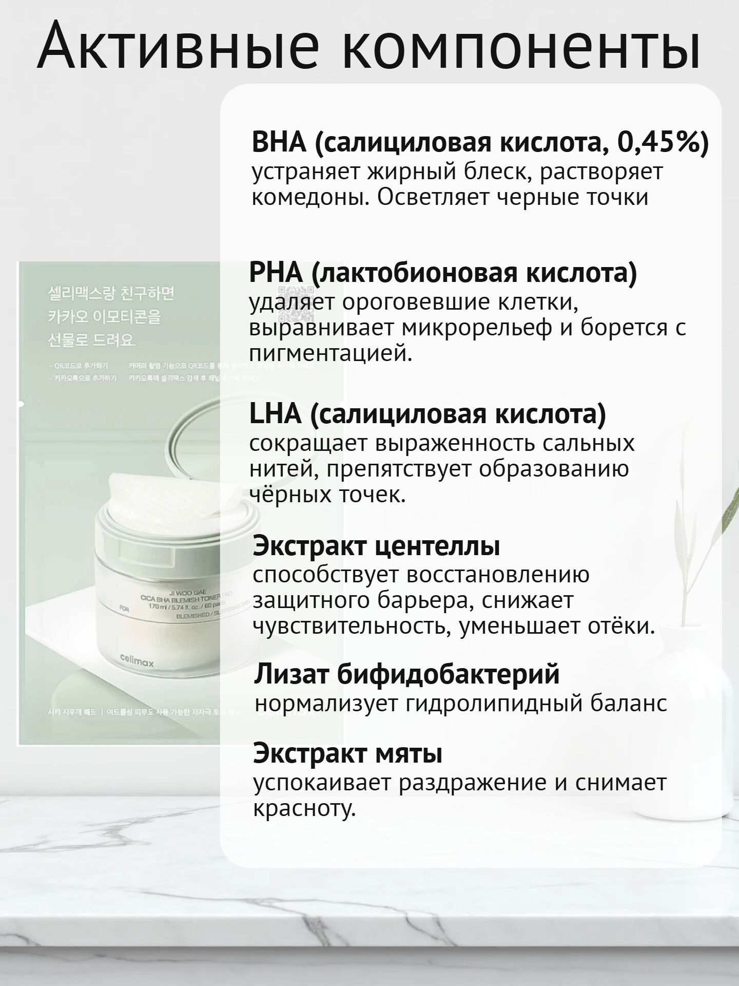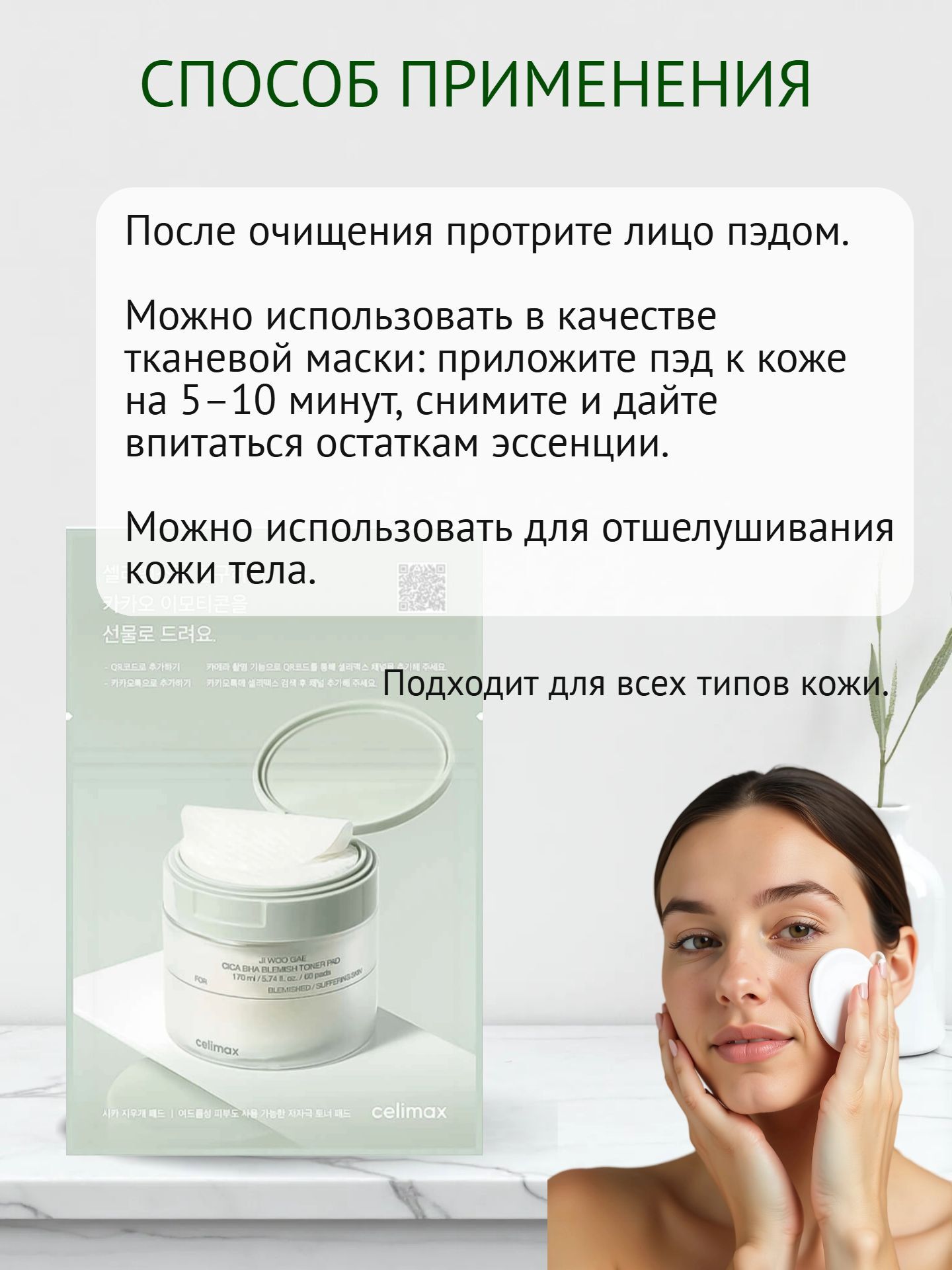 Пилинг-пэды от воспалений Celimax Ji Woo Gae Cica BHA Blemish Toner Pad удаляют омертвевшие частицы, предотвращают появление комедонов, снижают чрезмерную жирность и разглаживают рельеф, улучшая состояние кожи с акне.