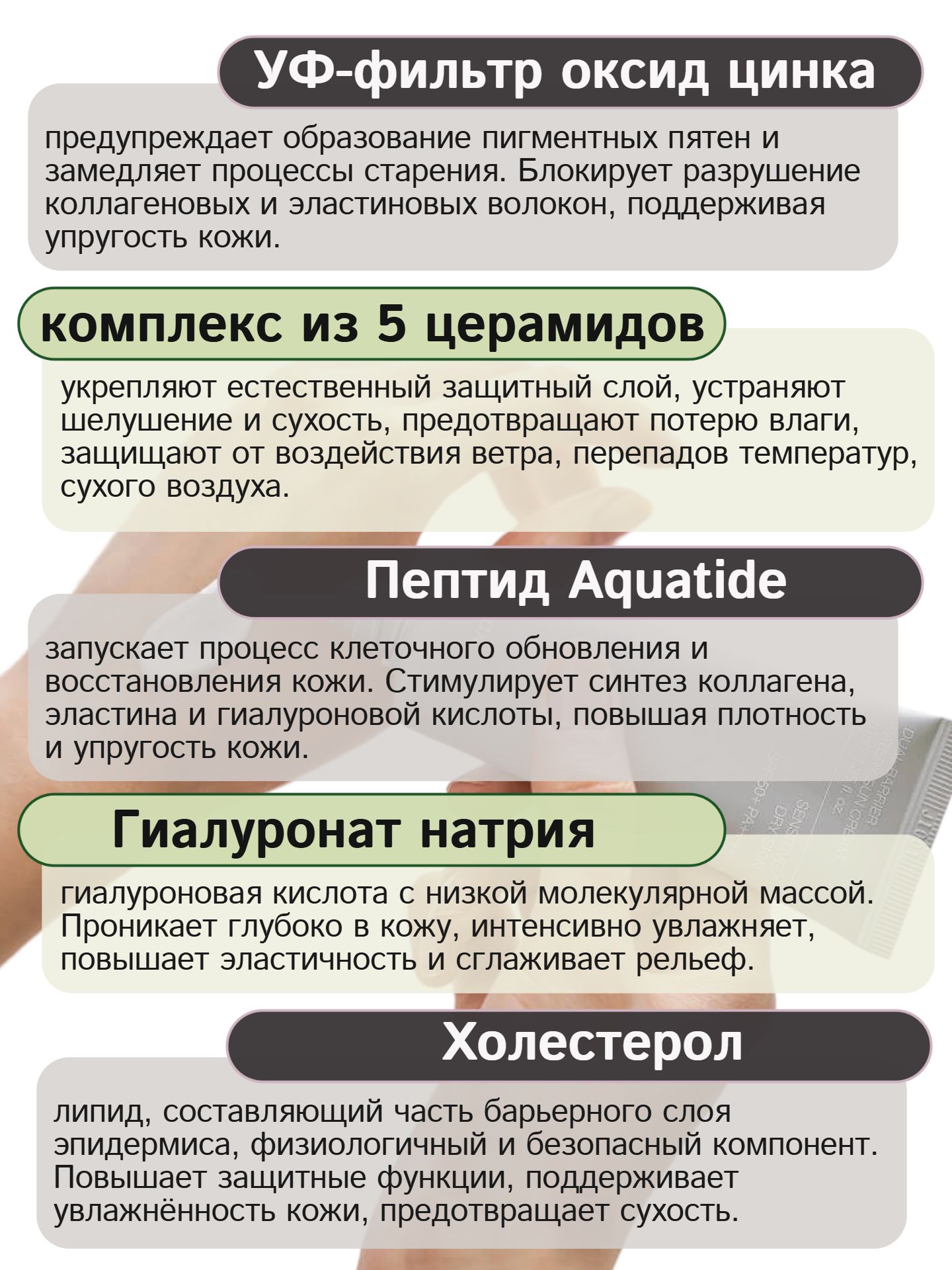 Ключевой компонент крема — комплекс из 5 церамидов, которые укрепляют естественный защитный слой, устраняют шелушение и сухость, предотвращают потерю влаги, защищают от воздействия ветра, перепадов температур, сухого воздуха.