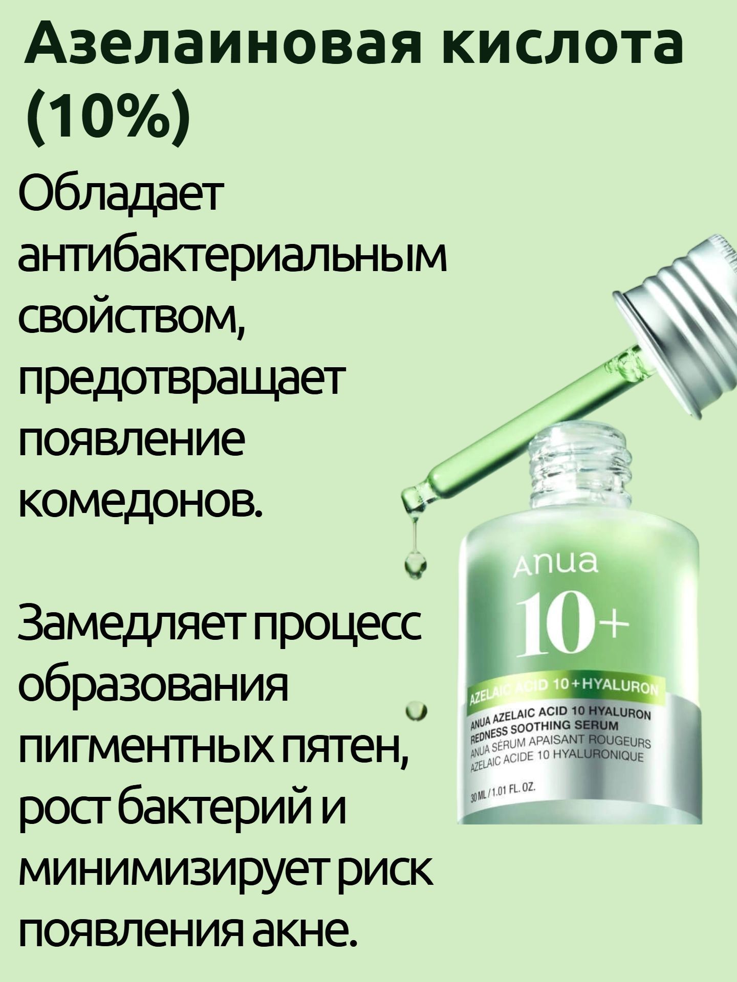 Сыворотка с азелаиновой кислотой Anua Azelaic Acid 10 Hyaluron Redness Soothing Serum успокаивает, уменьшает красноту и сокращает выраженность сосудистой сетки. Продукт укрепляет стенки капилляров, снижает проницаемость кожи и уплотняет ткани. Снимает зуд и раздражение, не провоцирует сухости.Продукт нормализует гидролипидный баланс и смягчает. Заживляет воспаление и акне, мягко осветляет пигментные пятна. Нейтрализует агрессивное воздействие внешних факторов, таких как резкие перепады температур, сухой воздух и УФ-излучение. Обладает лёгкой водянистой текстурой, не оставляет плёнки и жирности. Основные действующие компоненты:
