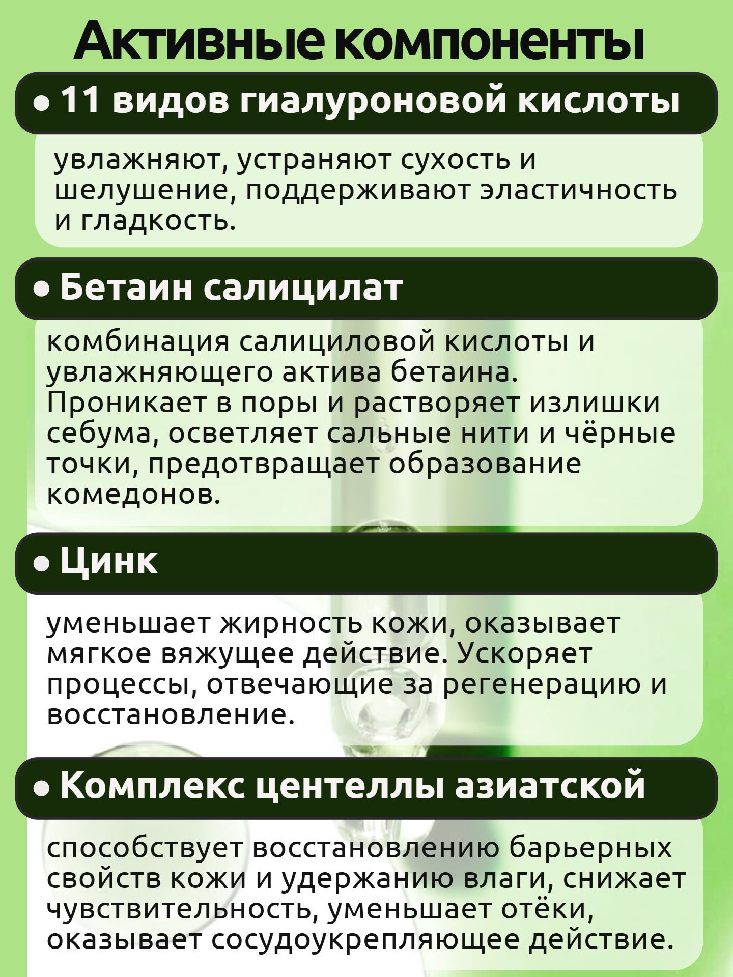 - Гиалуроновая кислота проникает в глубокие слои эпидермиса, способствует увлажнению и формирует защитный слой, который не даёт влаге испариться.