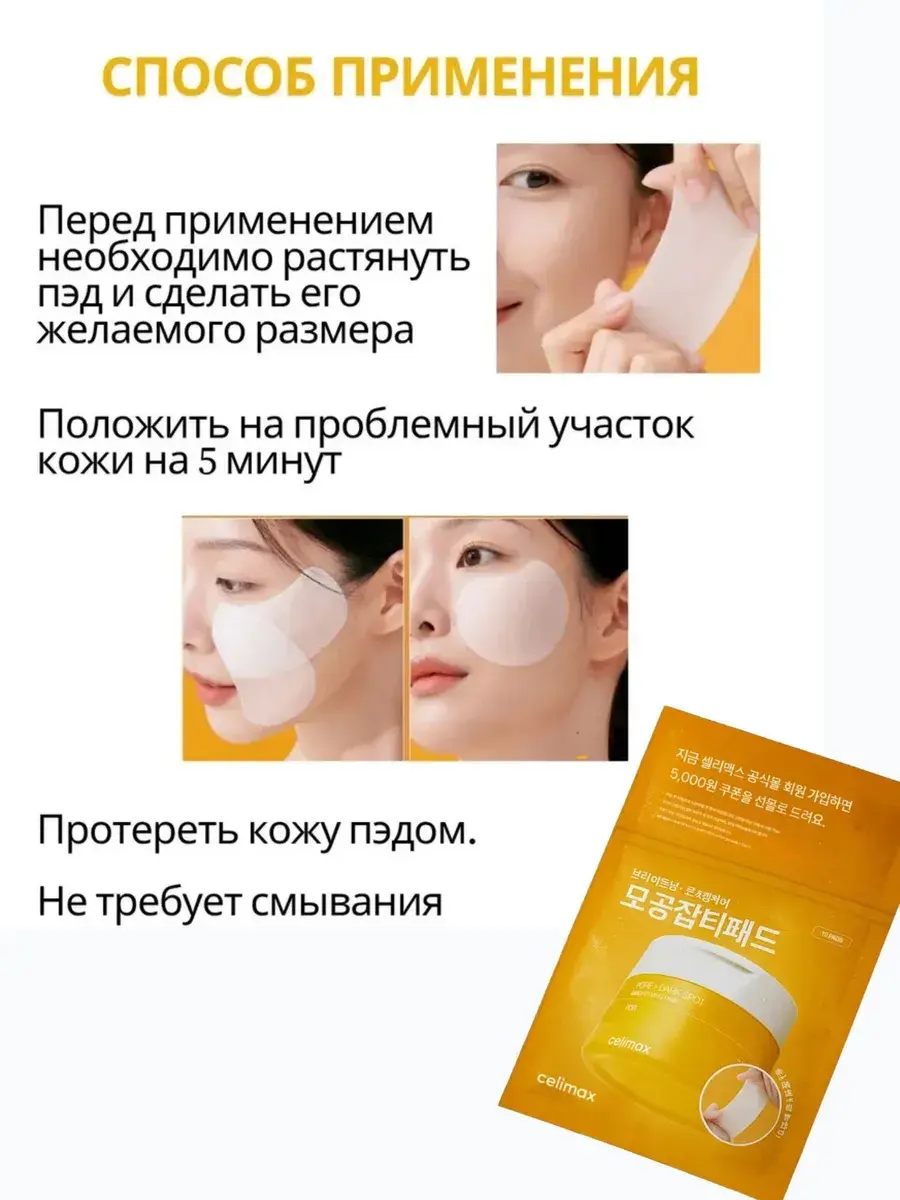 Способ применения: после умывания аккуратно протрите лицо. Можно использовать в качестве локальной маски: приложите пэд к коже на 3−5 минут, снимите и дайте впитаться остаткам эссенции.