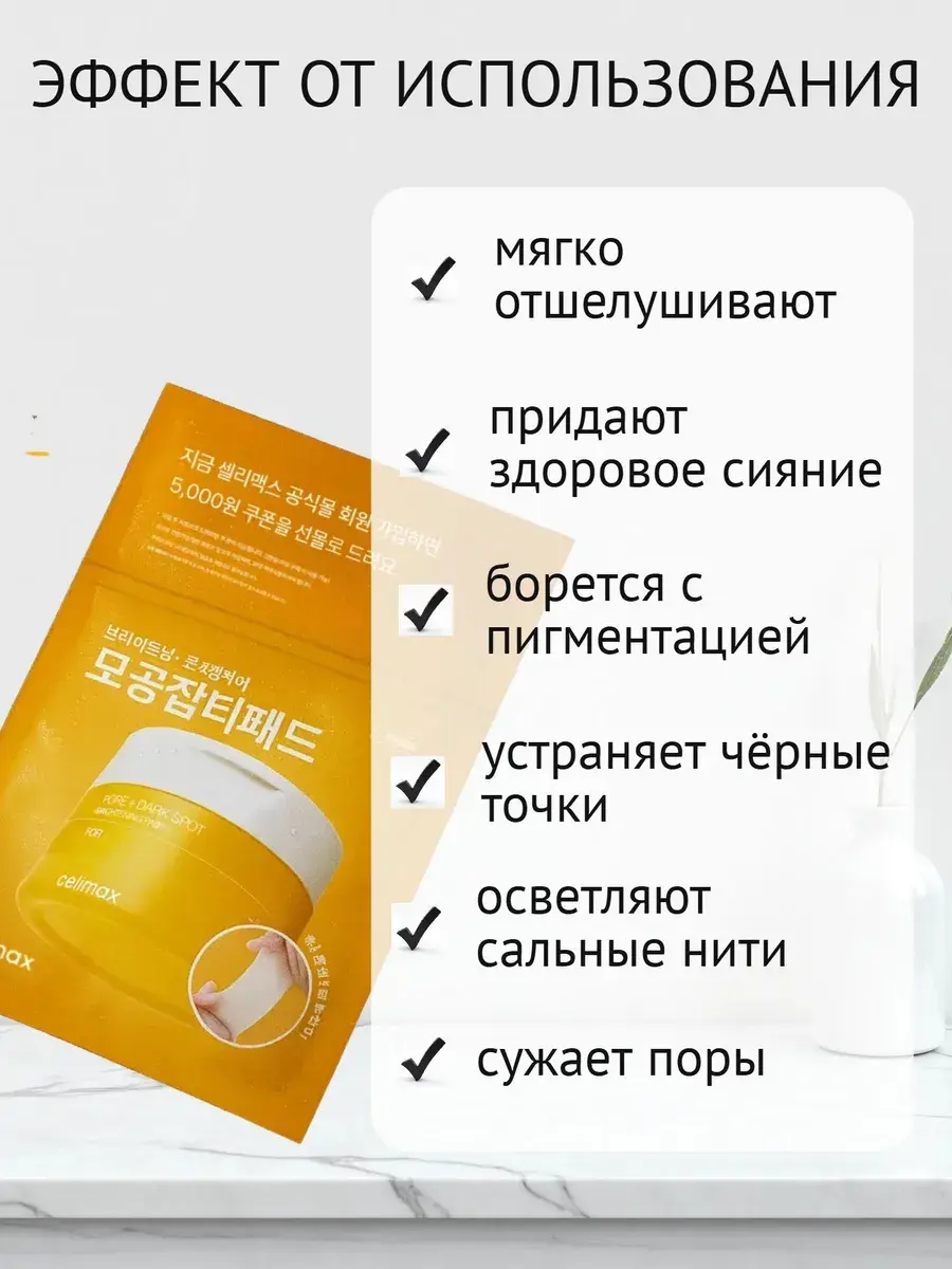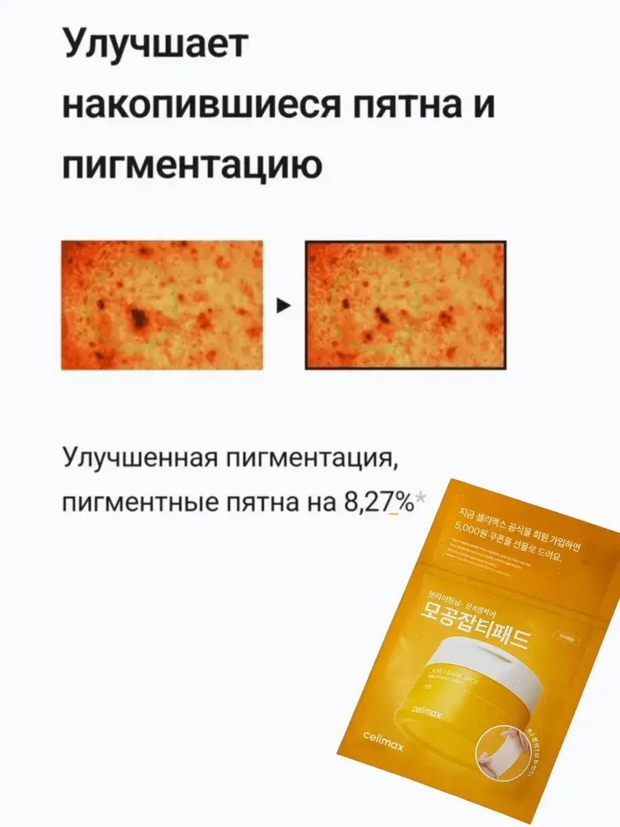Тонер-пэды CelimaxPore+Dark Spot Brightening Pad мягко отшелушивают, разглаживают текстуру, уменьшают выраженность постакне. Смягчают огрубевшие участки, устраняют тусклость, придают здоровое сияние. Осветляют сальные нити, способствуют сужению пор. Предотвращают появление пигментации: блокируют выработку меланина, препятствуют его транспортировке в верхние слои кожи.