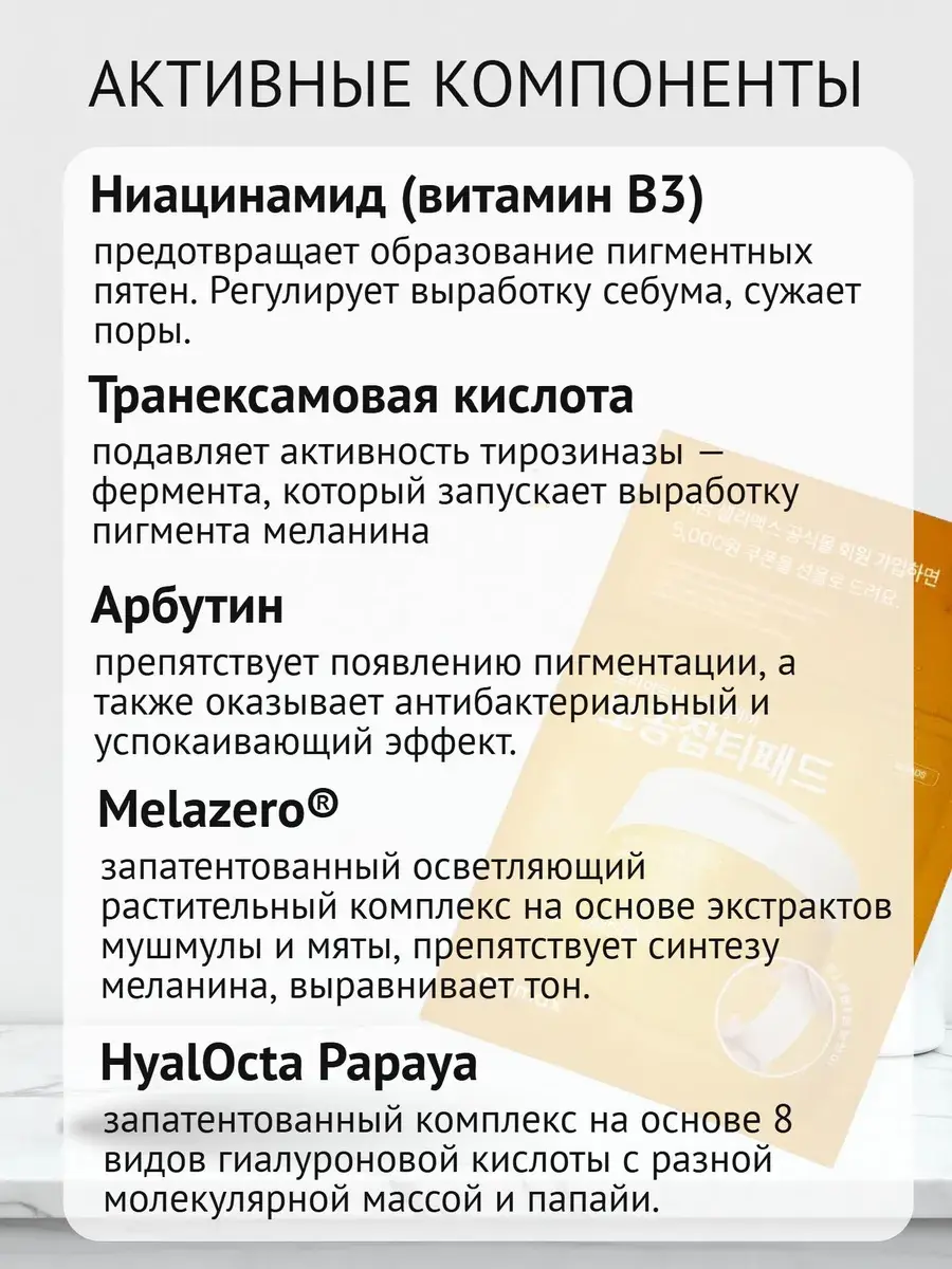 Транексамовая кислота — осветляющий актив, подавляет активность тирозиназы — фермента, который запускает выработку пигмента меланина. Не вызывает фоточувствительность, может использоваться в дневном уходе.