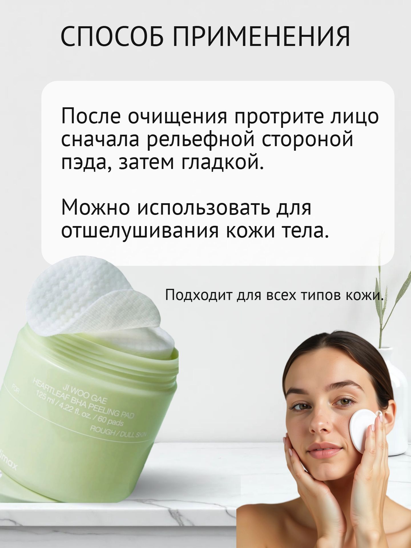 Пилинг-пэды Celimax Ji Woo Gae Heartleaf BHA Peelind Pad прекрасно очищают, избавляют от жирного блеска, борются с воспалениями и чёрными точками, освежают и тонизируют.
