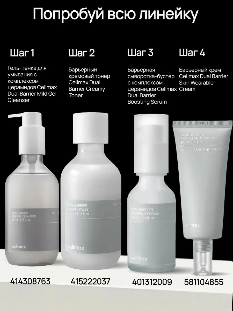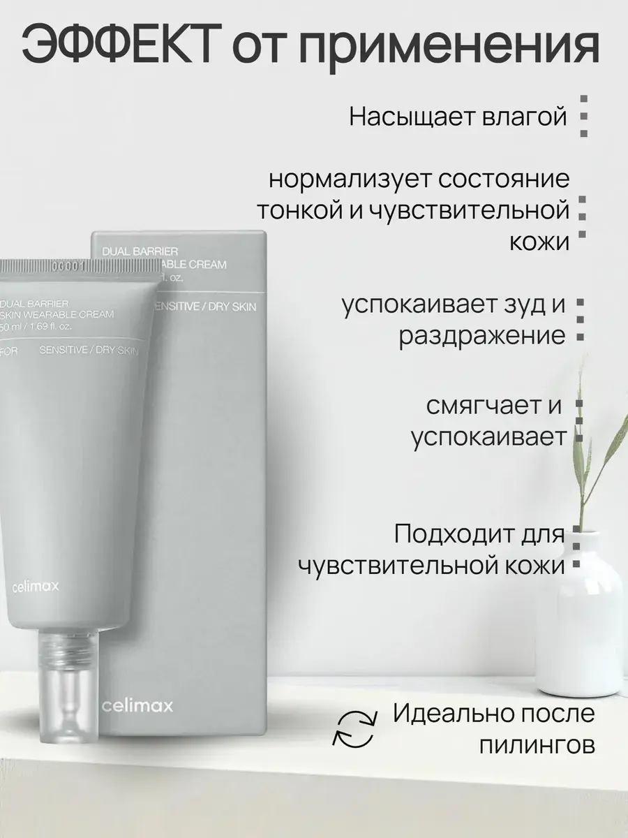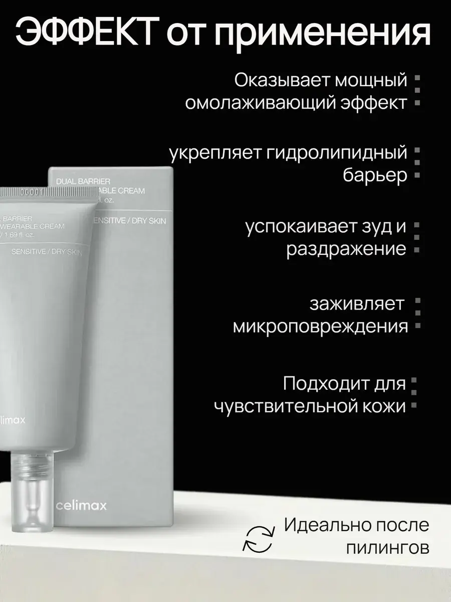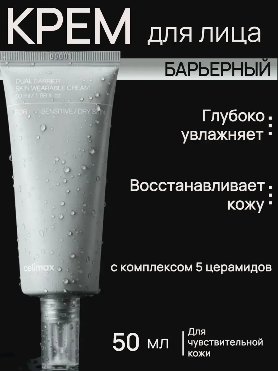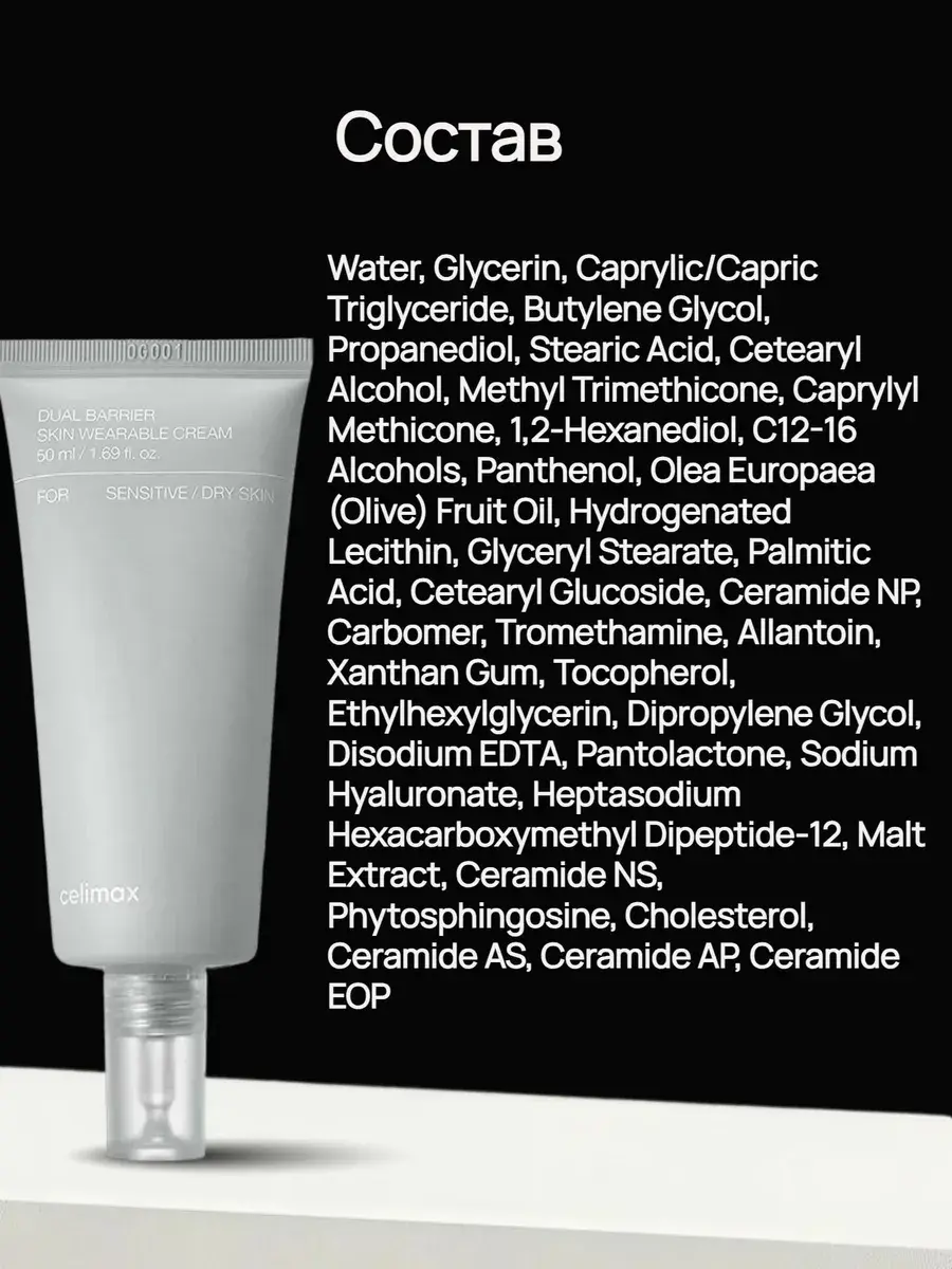 Celimax Dual Barrier Skin Wearable Cream —корейский крем для лица и шеи с церамидами и пептидом Aquatide, разработанный специально для восстановления и укрепления защитного барьера кожи. Увлажняющий крем глубоко увлажняет, питает и защищает кожу от негативного воздействия внешних факторов, таких как холодный и сухой воздух, перепады температур и ветер. Средство для лица эффективно устраняет сухость и шелушение, смягчает кожу, снимает раздражения и чувство стянутости, делая её мягкой и упругой. Формула крема включает комплекс из 5 церамидов, которые идентичны липидам эпидермиса и встраиваются в естественный барьер кожи, укрепляя его и предотвращая чрезмерную потерю влаги. Уникальный запатентованный пептид Aquatide активизирует процессы клеточной регенерации, ускоряет аутофагию — переработку омертвевших частиц клеток в полезные вещества, такие как коллаген, эластин и гиалуроновая кислота, что способствует повышению эластичности кожи и оказывает выраженное антивозрастное действие. Дополнительные активные компоненты — аллантоин, экстракт центеллы, пантенол и гидрогенизированный лецитин — усиливают увлажняющий и восстанавливающий эффект, снимают воспаления, улучшают текстуру кожи и возвращают ей здоровый цвет. Ламеллярная структура эмульсии способствует глубокому проникновению активных ингредиентов, благодаря чему крем работает максимально эффективно. Гипоаллергенная формула без искусственных ароматизаторов делает крем подходящим даже для чувствительной и реактивной кожи. Уже после регулярного применения кожа становится более гладкой, упругой и защищённой, нормализуется её гидробаланс и укрепляется иммунитет. Крем Celimax Dual Barrier Skin Wearable Cream подходит для сухой, обезвоженной, чувствительной кожи, а также может использоваться подростками. Средство универсально: его можно наносить утром и вечером.