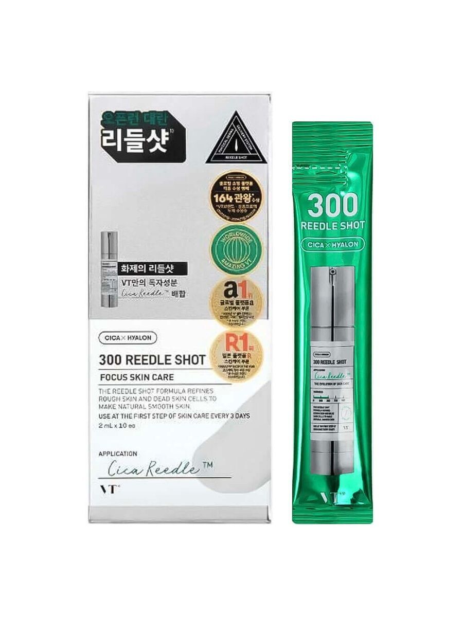 Интенсивная бустер-сыворотка с микроиглами VT Cosmetics Reedle Shot 300 запускает механизмы оздоровления и обновления кожи за счёт деликатного отшелушивания и восстановления. Действие продукта нацелено на преображение текстуры и улучшение цвета лица. При его регулярном использовании разглаживается микрорельеф — уменьшается размер и глубина пор, снижается частота проявлений гиперкератоза. Средство обеспечивает постепенное осветление пигментации различного происхождения: веснушек, постакне, пигментных пятен коричневого и жёлтого оттенков. Сыворотка восполняет дефицит влаги в роговом слое эпидермиса, придает упругость, эластичность и сияние. Комплекс Cicahyalon™ (гиалуроновая кислота, производные центеллы азиатской, зелёный прополис) интенсивно увлажняет, оказывает противовоспалительное действие, снижает реактивность кожи и укрепляет естественный защитный барьер.Микроигольчатая технология CicaReedle™ (237 000 ppm) обеспечивает доставку активно действующих компонентов в глубокие слои эпидермиса и стимулирует процессы обновления клеток. Микроиглы в 14 раз меньше размера пор, их оболочка содержит 14 видов минералов, необходимых для подавления воспалительных процессов и ускорения заживления за счёт улучшения кислородного обмена. Основные действующие компоненты: